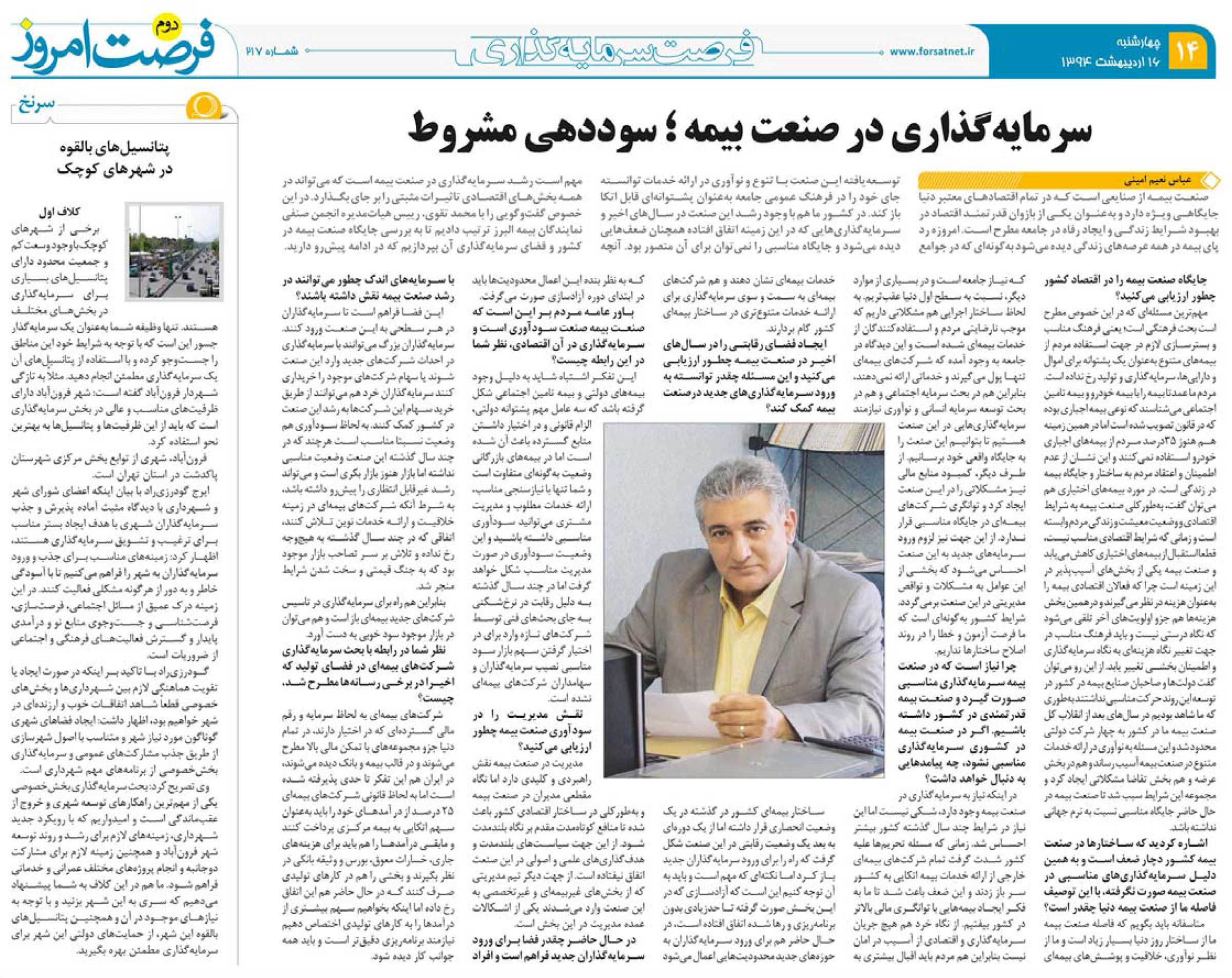 مصاحبه محمد تقوي رئيس هيأت مديره انجمن صنفي نمايندگان بيمه البرز با روزنامه فرصت امروز | یکشنبه | 6 اردیبهشت 1394 « آينده سازان بدون آينده »